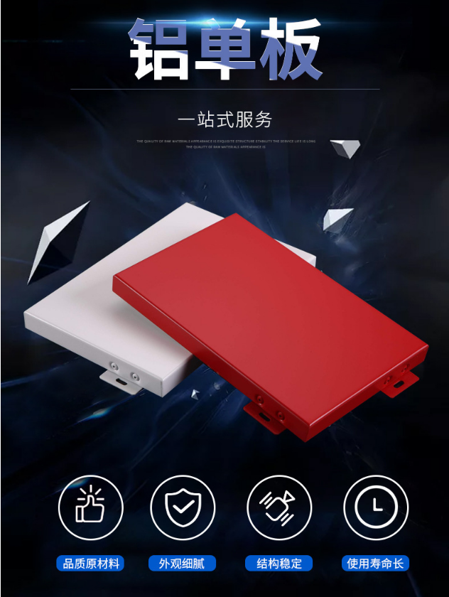 氟碳鋁單板采用優質高強度鋁合金板材,經過數控折彎等技術成型,主要由面板、加強筋和角碼組成。加強筋與板面后的電焊螺釘連接,使之成為一個牢固的整體,極大增強鋁單板幕墻的強度與剛性,保證了長期使用中的平整性及抗震能力.